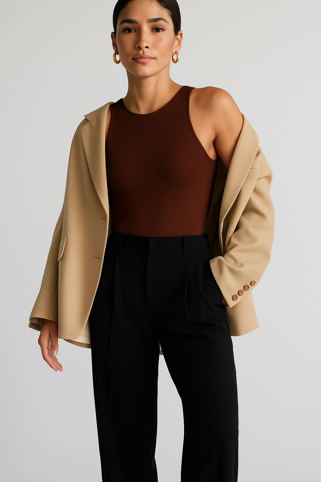 La doble capa frontal ayuda a controlar visualmente el abdomen, mientras que la lycra de tacto sedoso se adapta perfectamente a cada curva sin marcar. Ideal para outfits formales, casuales o para usar como base en looks de capas.