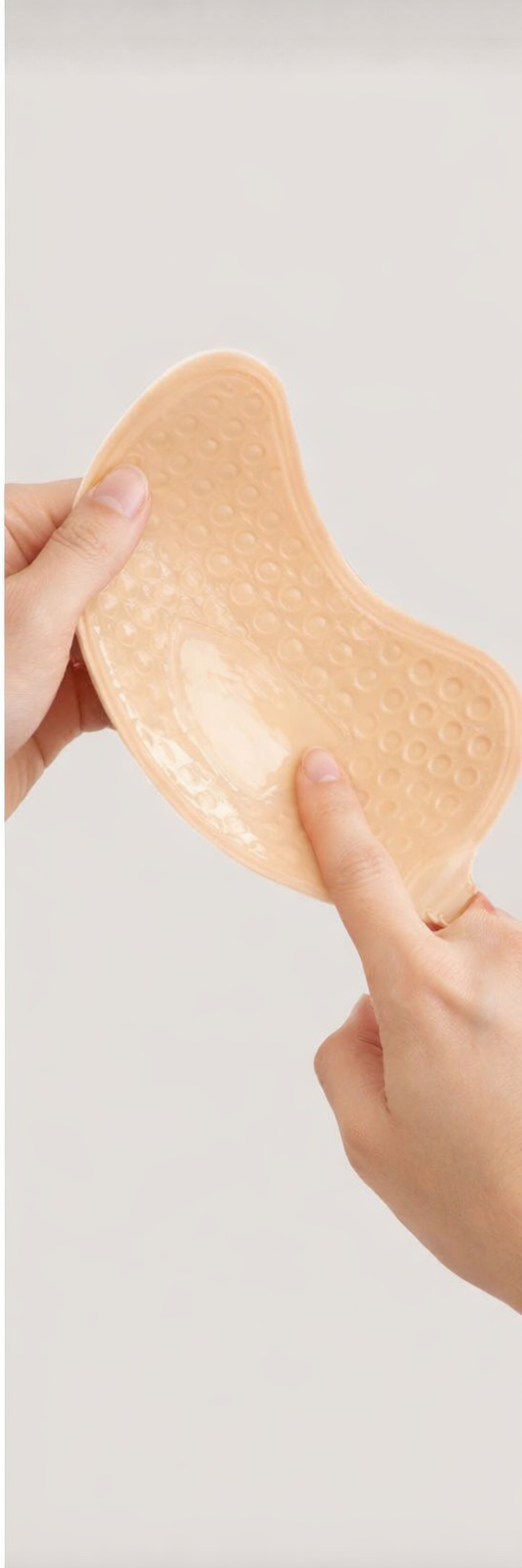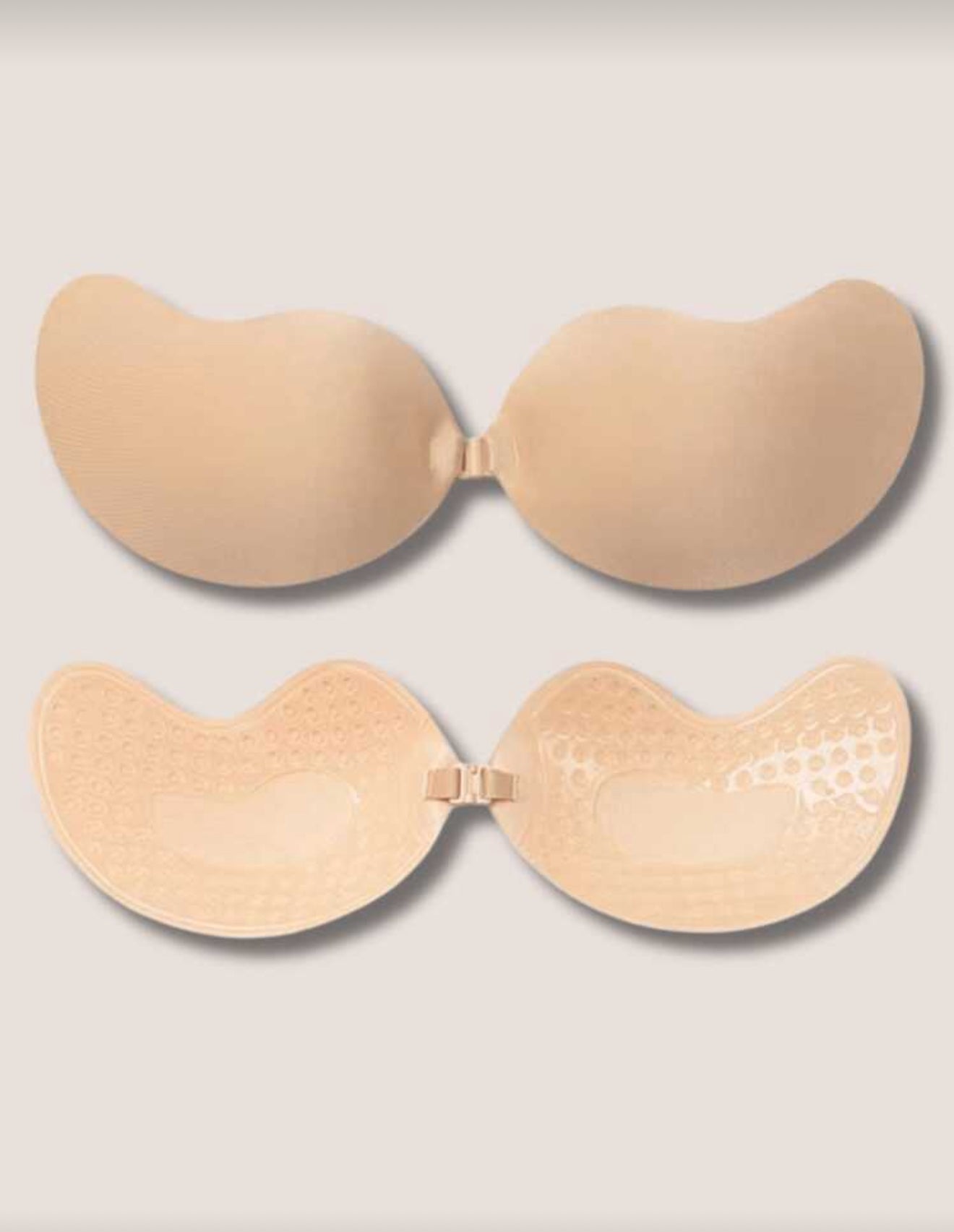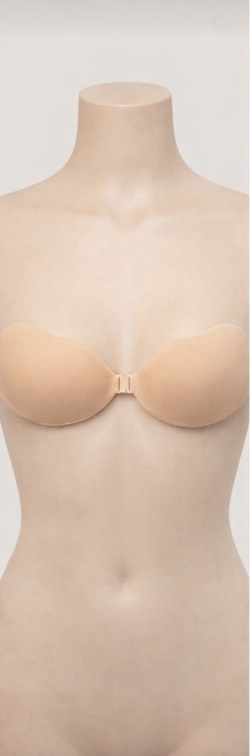 Prenda invisible que se adhiere directamente a la piel para dar soporte y realce sin tirantes ni espalda, ideal para escotes pronunciados, usando copas de tela con adhesivo hipoalergénico y un broche frontal para unir los senos, siendo reutilizable tras lavarlo y secarlo al aire para reactivar su pegamento, y perfecto para vestidos sin espalda, halter o strapless.